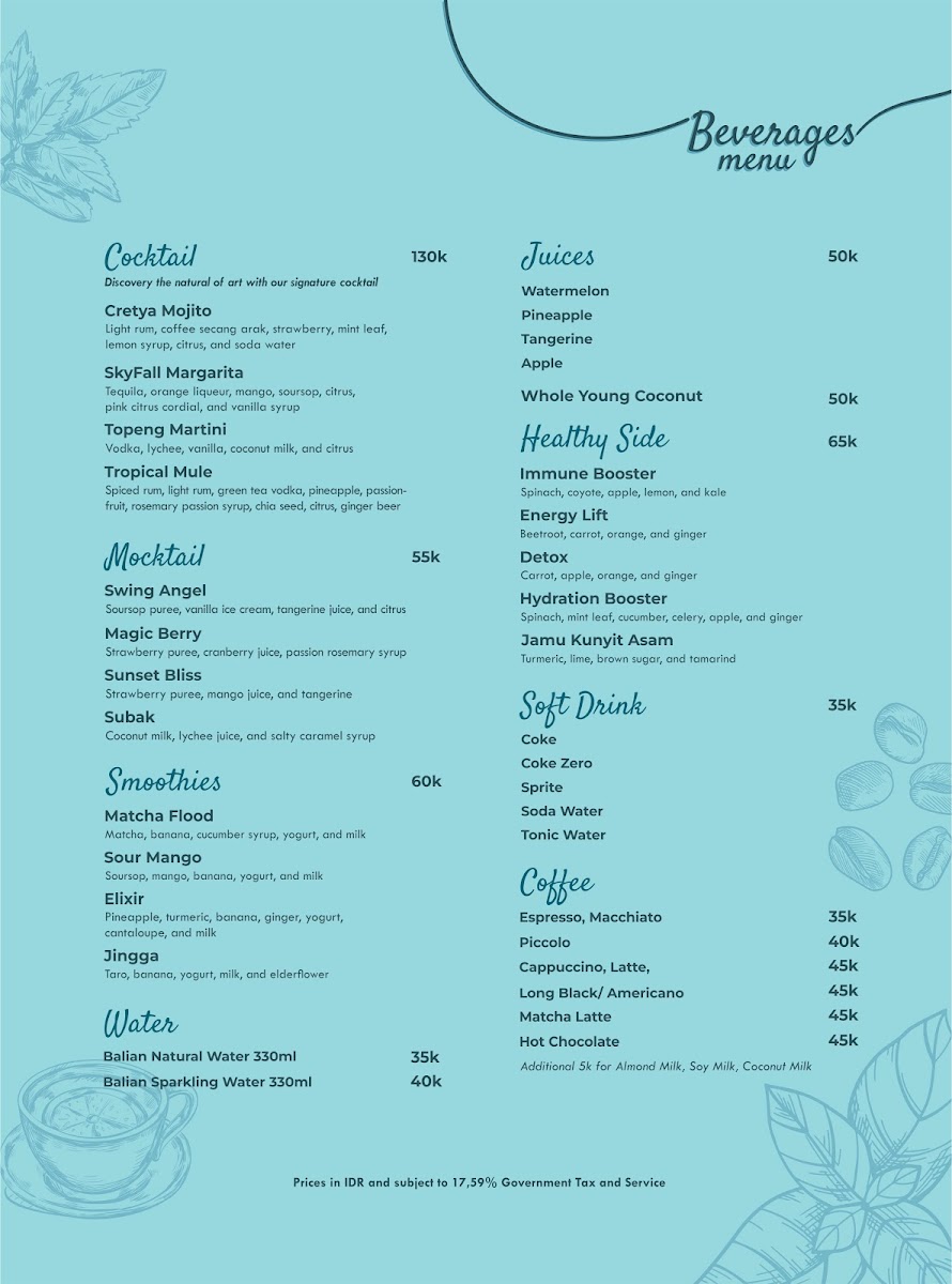 Welcome to Cretya Lite, a culinary gem nestled in the serene landscapes of Tegallalang, Bali. Our menu is a delightful embodiment of global flavors, prominently featuring three distinct sections: Western, Asian, and Indian cuisine. Each dish is crafted with fresh, high-quality ingredients that deliver an unforgettable gastronomic experience.